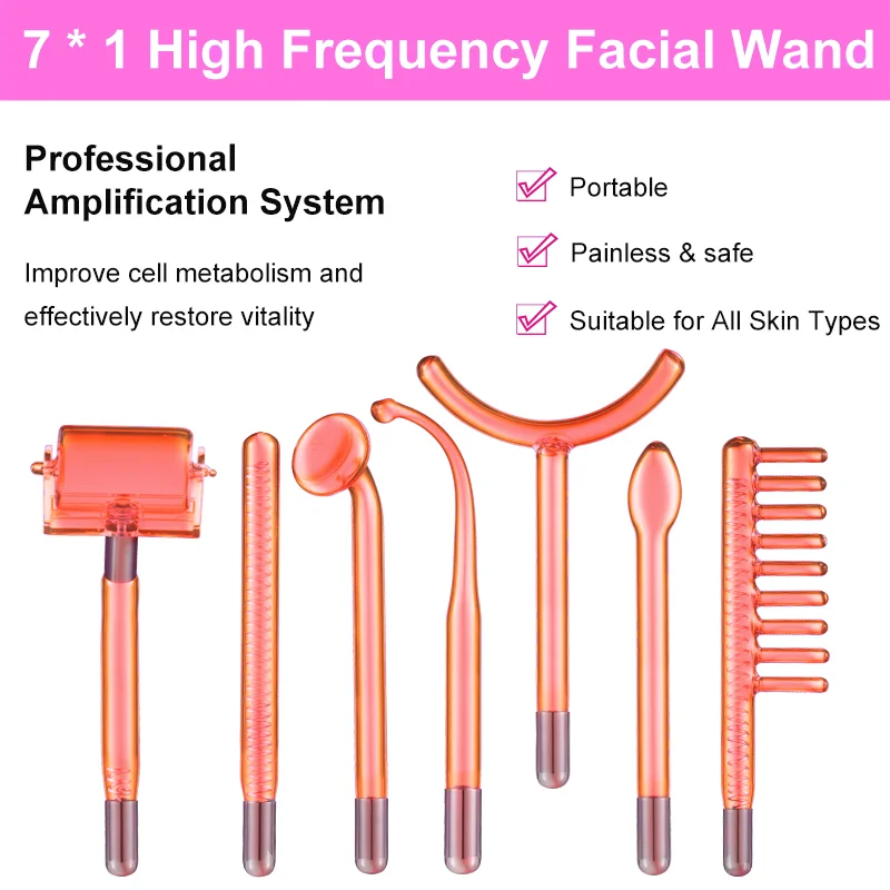 High-frequency electrotherapy beauty instrument electrotherapy tube is filled with Neon/Argon rare gas, which acts on the skin after being energized to produce high-frequency current, this high-frequency current can enhance the basal activity of the skin, improve the texture of the skin, and enhance the defense ability of the skin against bacteria. And due to the formation of ozone, it can effectively sterilize and disinfect, while accelerating skin metabolism, promoting skin secretion of excess oil, balancing oil and moisture, and keeping the skin clean. At the same time the product improves the elasticity of the skin through vibration, so that the skin is tighter, not easy to be propped up, the face has an effective lifting effect. And the beauty instrument and skin contact with a slight heat sensation, can make the nerve excitement value reduced, to achieve a calming effect on the nerves and pain relief. Comb type electric therapy tube through the vibration with the scalp and hair follicles, can effectively stimulate the hair follicles, promote hair growth.